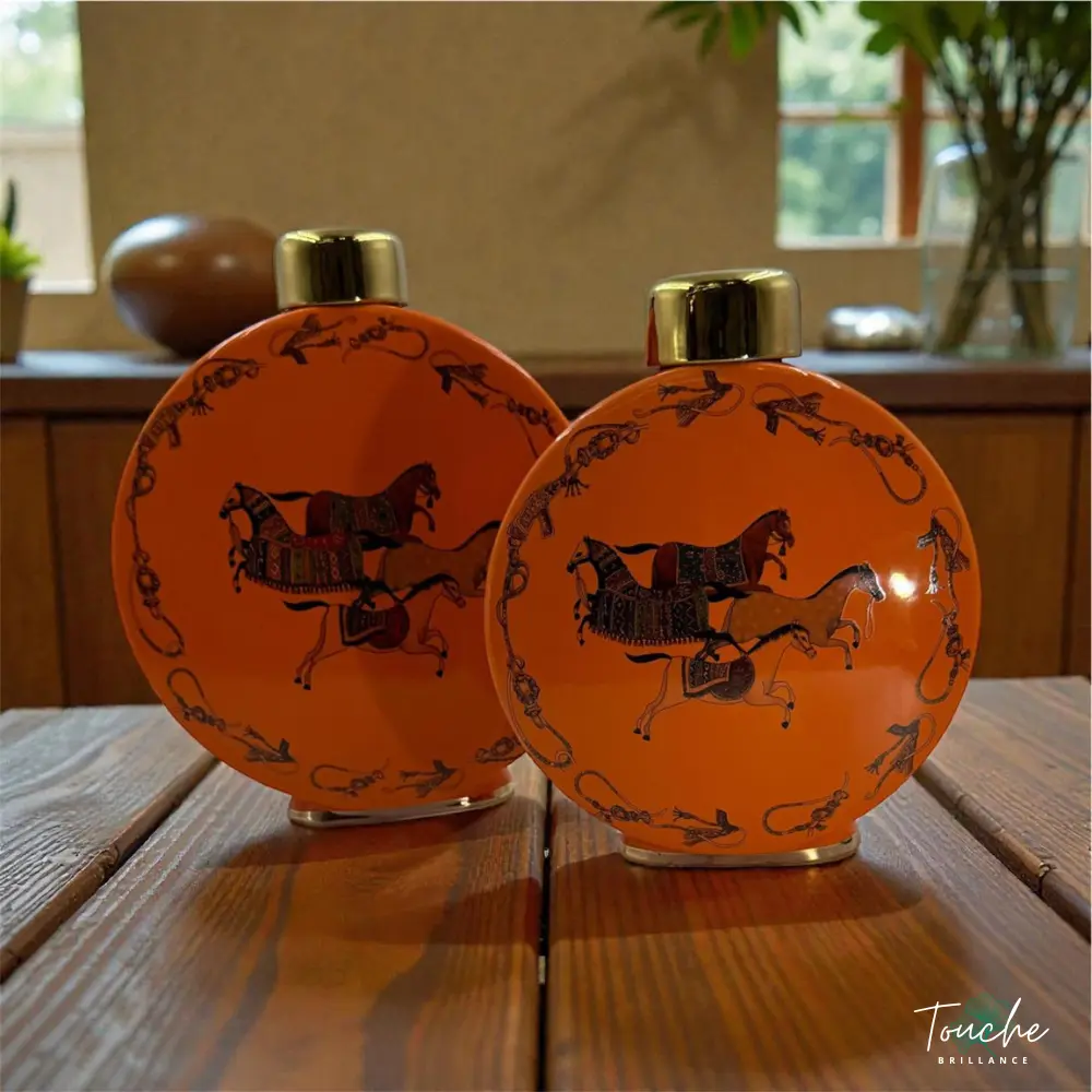 Ce duo de vases en porcelaine d’inspiration Hermès apporte une touche d’élégance et de raffinement à tout intérieur. Leur design circulaire, associé à une couleur orange chaleureuse, s’inspire de l’univers du luxe et du savoir-faire artisanal.